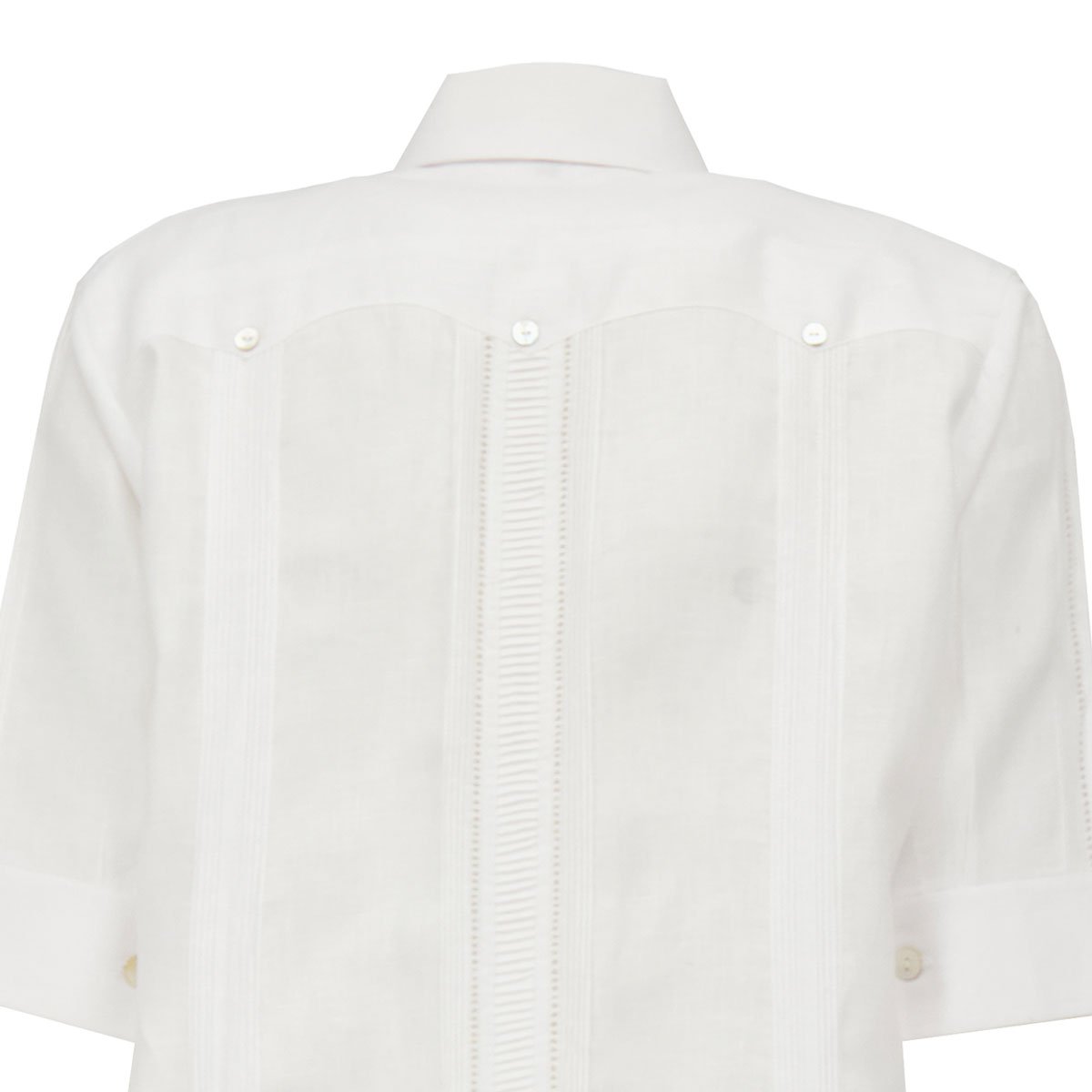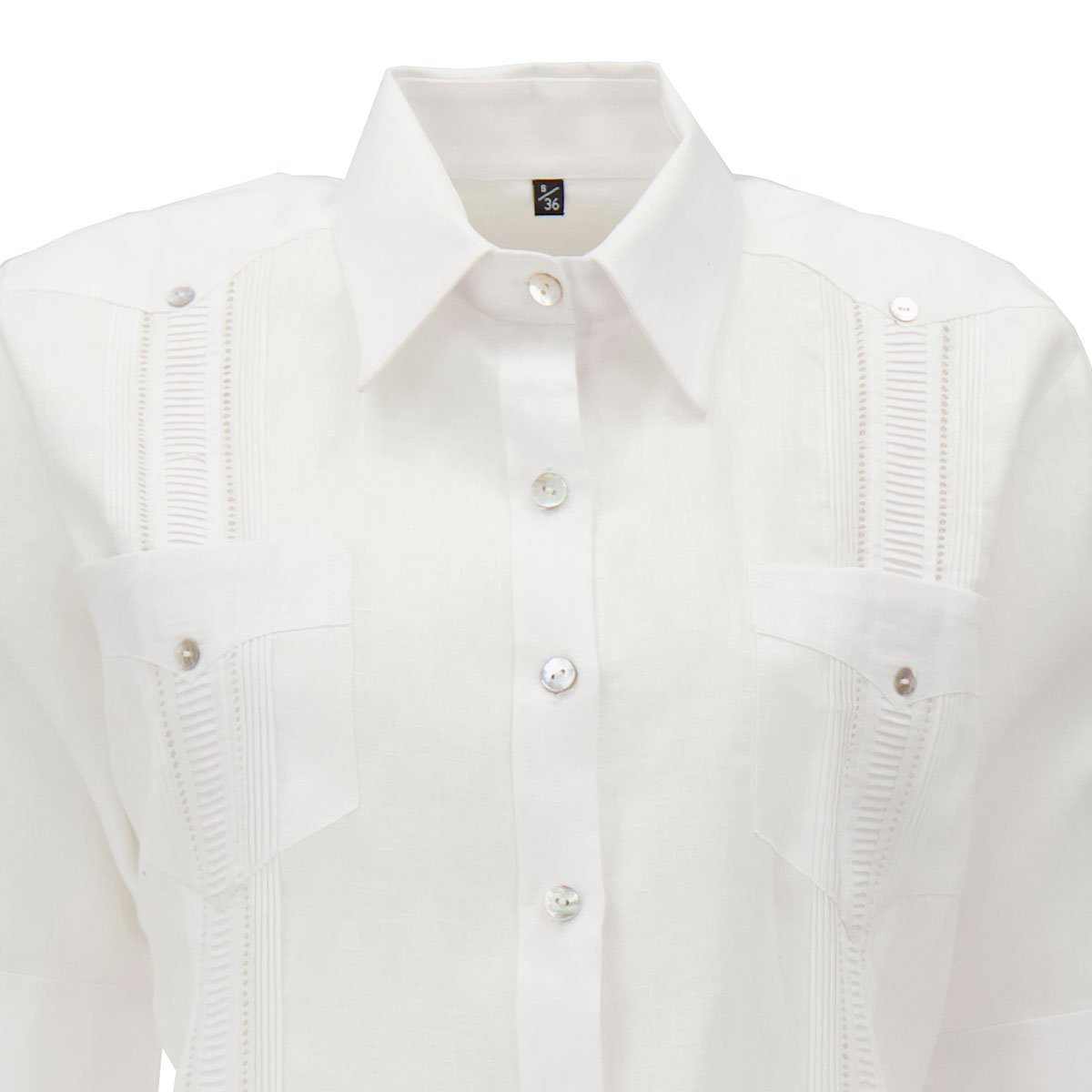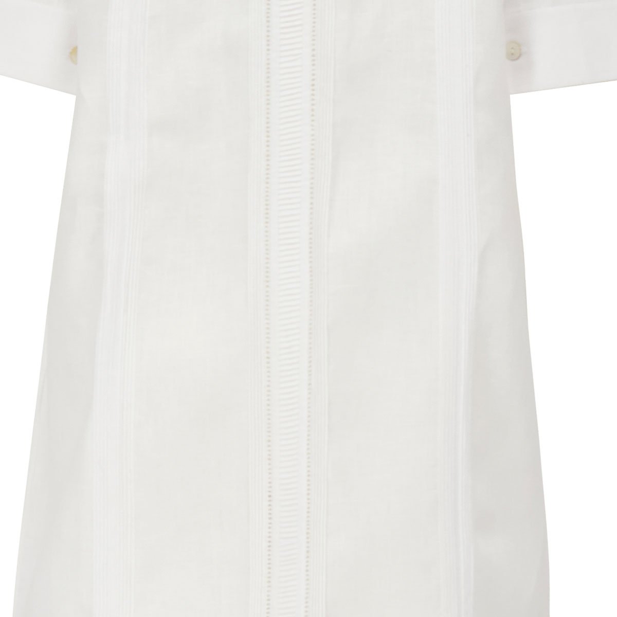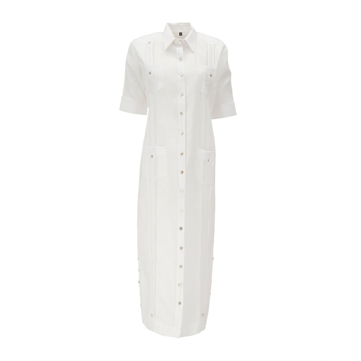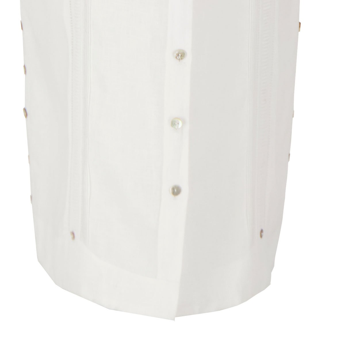 Vestido Guayabera largo manga 3/4 para dama 100% LINO con ALFORZAS, 2 REJILLA, ALFORZA HORIZONTAL EN DELANTERO Y TRASERO, 2 GRUPOS DE ALFORZAS ADICIONALES TRASEROS y botones de concha natural.